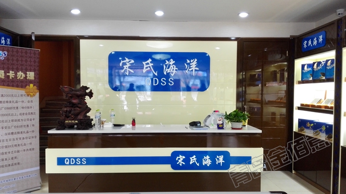 其他海参店展柜,除了名字不一样,其他都一样,朱红色烤漆、镂空花格、黄色透光石;这个海参店展柜,从造型、颜色搭配、LOGO运用,都别具一格,效果非常好。